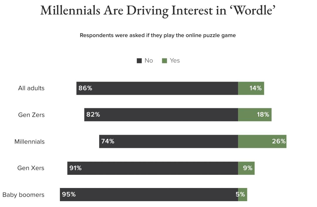 今年1月,在不到10天的时间里,《Wordle》的用户规模从30万飞速增长到200万,此后蔓延之势一发不可收拾。彼时追踪该游戏的Morning Consult公司调查后宣布:14% 的美国成年人在玩这款游戏,《Wordle》正成为千禧一代的新宠。