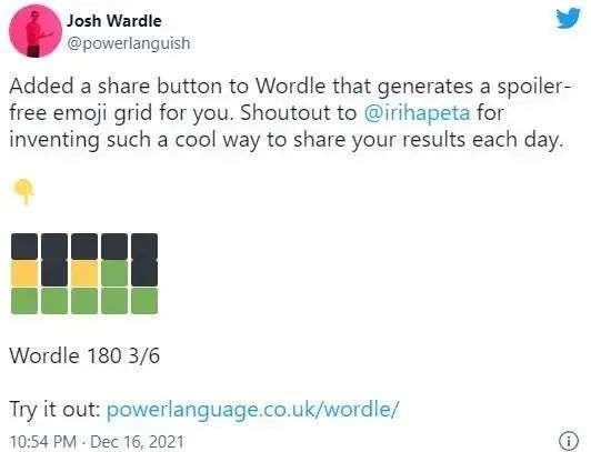 这样做的好处是,既不会透露当天的谜底,又能展现出个性化的猜谜过程。沃德尔很快注意到了这个绝妙的点子,他说:“我看到很多玩家跳了出来做相同的事,他们花时间打开emoji键盘,拼出自己的网格。所以我把这种分享功能放进了游戏里。”