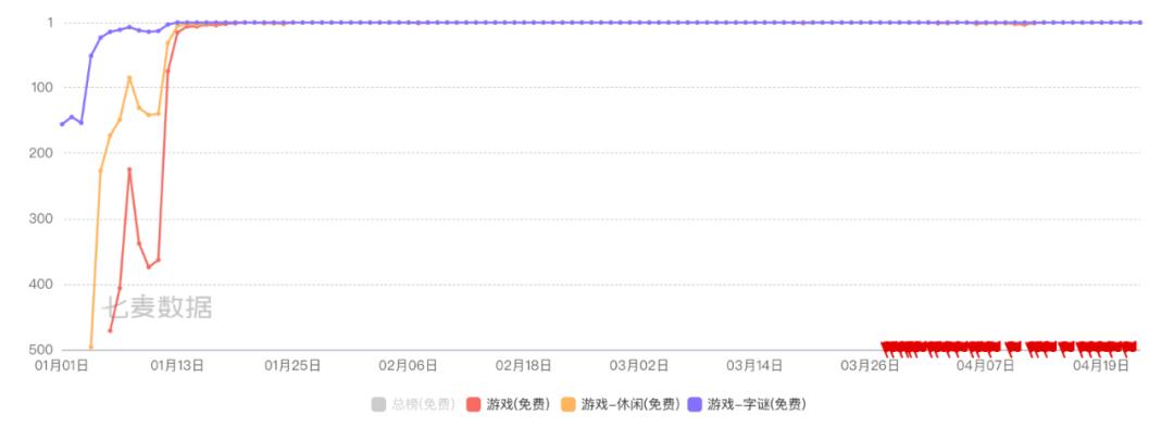 《Wordle!》2022年01月01日 - 2022年04月23日排名趋势,图源七麦数据