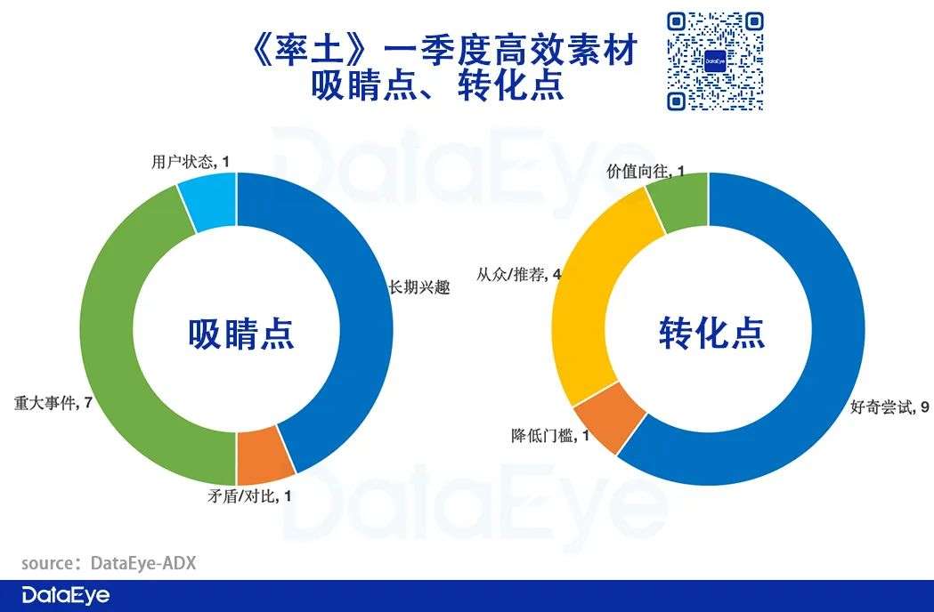 《率土》:求变。不论是对创意套路的不断创新,还是slogan的不断变化,甚至是玩法上的推陈出新,都可以看出网易不断在突破过去,寻求不同。这本质还是求快、求新、求量,希望不断用新奇的刺激点、套路低价获客。《率土》的“品效合一”,实则是略微倾向效果的。