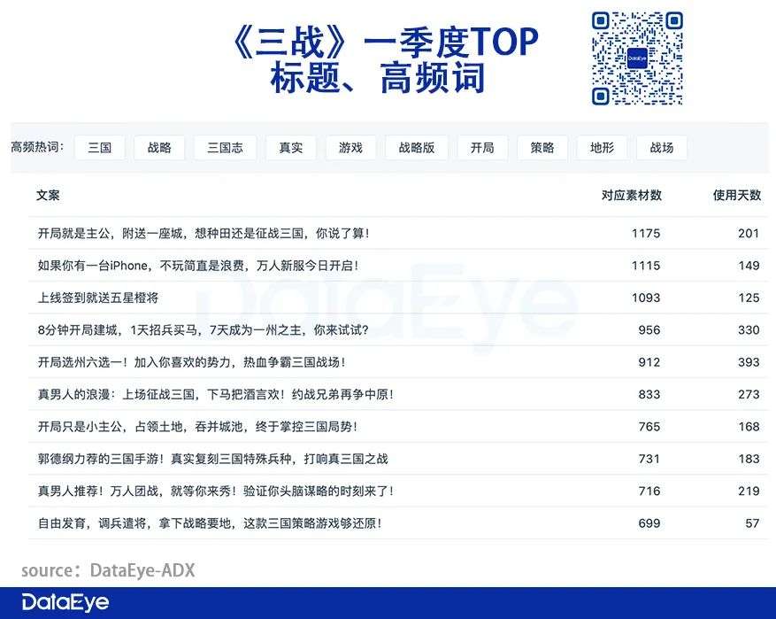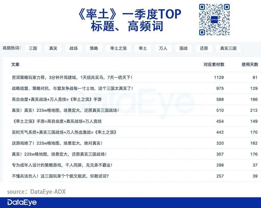本次研究涵盖了《三国志·战略版》《率土之滨》《文明与征服》《重返帝国》《无尽的拉格朗日》《万国觉醒》《阿瓦隆之王》共7款头部SLG,并选取了计划使用TOP5(投放次数最多)、投放天数TOP5(投放时间最长),共7 X 10组买量视频(以下简称“高效素材”),以回顾一季度国内战况。具体广告视频案例,也一一进行了举例、分析。
