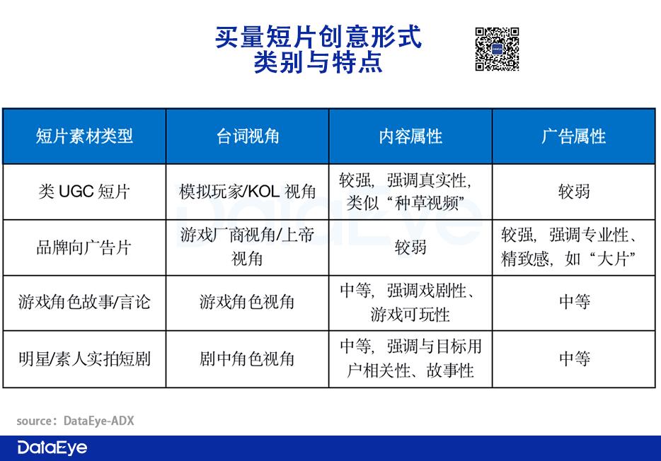 在创意形式层面,广告往往采用类UGC短片(类原生视频)、品牌向广告片、游戏角色故事/言论、明星/素人实拍短剧、游戏实录、明星主播出镜等方式包装,常见的四种创意形式,以及特点如下表。