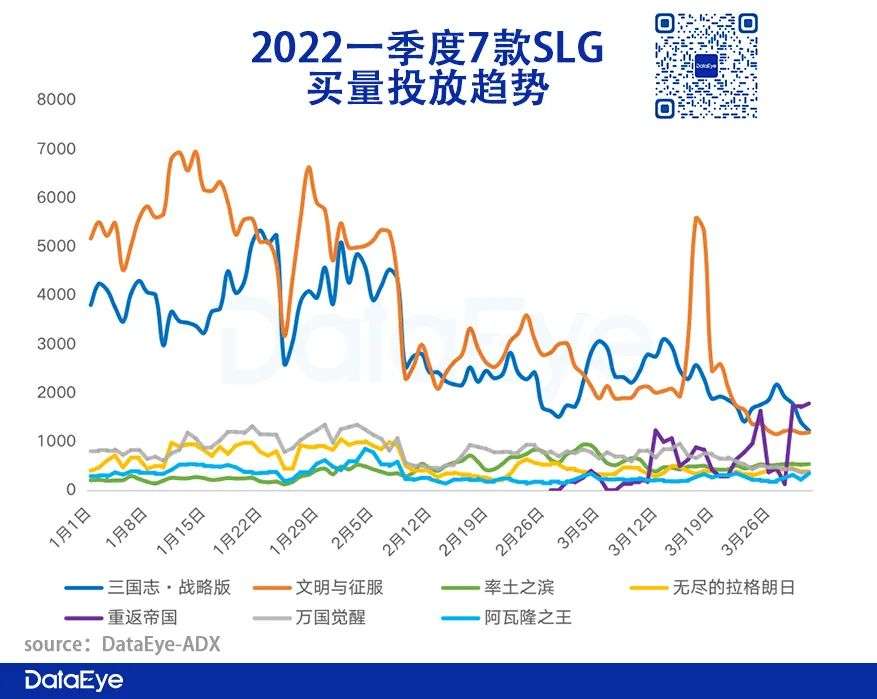 2022年一季度,《三国志·战略版》与《率土之滨》针尖对麦芒,不仅竞争“真实”概念,还在玩家数量上你追我赶;《文明与征服》买量登顶,祭出了前所未见的突出“低氪度”的打法;而《重返帝国》则是腾讯天美“营销升级”后冲击赛道的力作,买量短期冲高,最近把买量大户《三国志·战略版》都超越了......