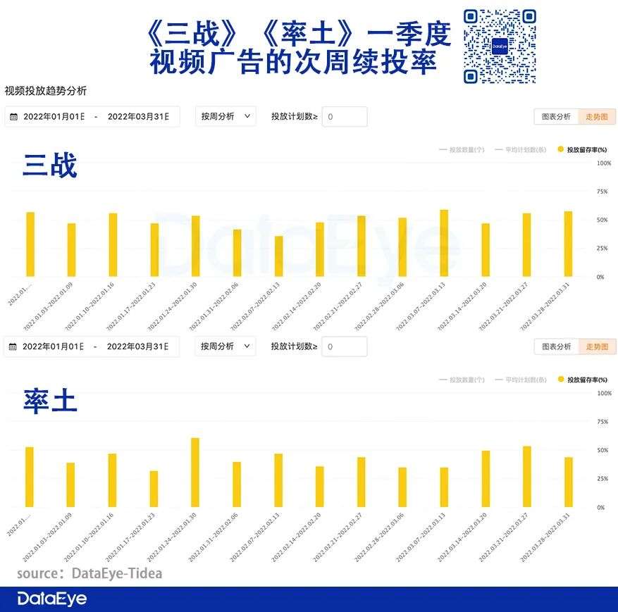 △DataEye-Tidea数据显示:《三战》一季度买量视频广告的次周视频留存率,较稳定,普遍高于48%,原因是对视频有一定自信,对效果要求不苛刻;而《率土》这一数据往往低于《三战》,且更不稳定,原因是对效果要求严苛。