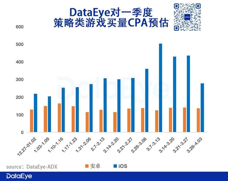 从CPA角度看:两款游戏推高3月CPA。今年以来IOS端策略类CPA预计200-300元/A,安卓端也在120元以上。特别是3月IOS端飙升最高可达500元/A,这主要因为《重返帝国》公测以及《文明与征服》新角色上线,短期内加大投放所致。3月末CPA回落,但同样也高的惊人——赛道进入门槛进一步抬高,没几个亿怕是烧不过这群狠角色。