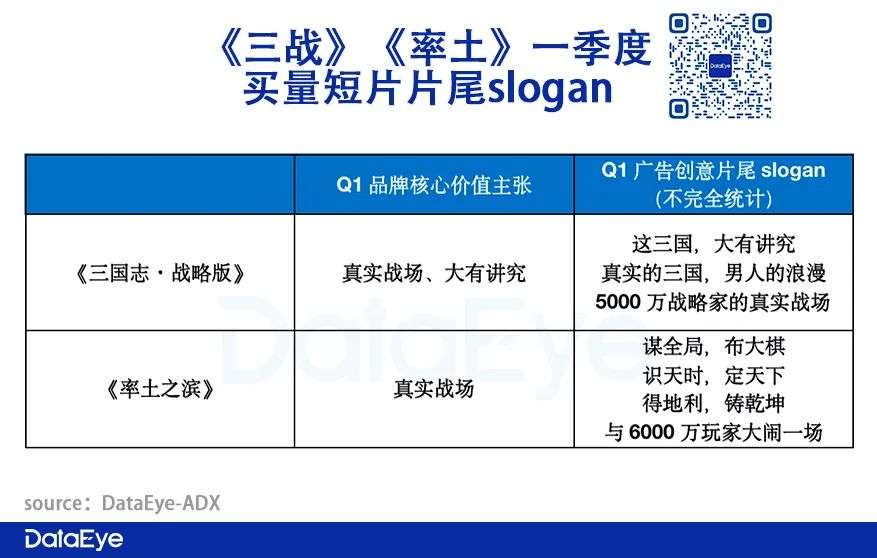 片尾slogan:此前《三战》的slogan多且没有紧贴品牌核心价值主张,但到了一季度有所改善。“这三国,大有讲究”、“真实的三国,男人的浪漫”。《三战》的slogan直接体现“真实、讲究”的品牌核心价值主张,非常直接、通俗、口语化,易于玩家之间口口相传。据我们在玩家群内“卧底”观察,玩家确实偶尔自发传播这两句话。(具体对于slogan的解析和原理,我们放在《率土之滨》部分)
