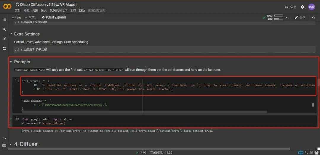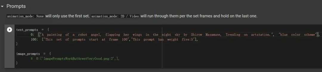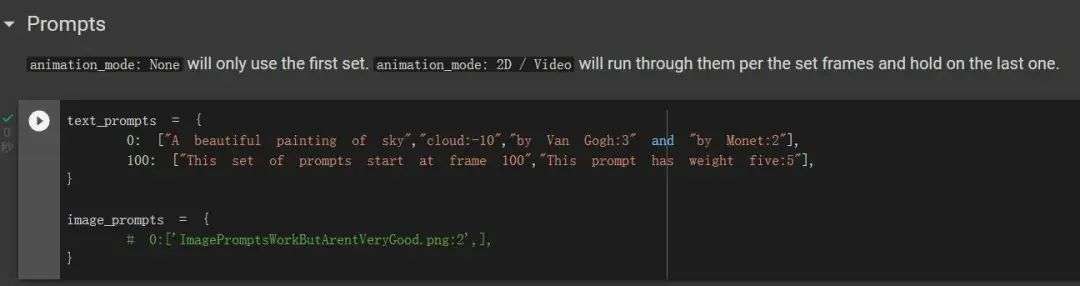 接下来就是最重要的通过关键词描述画作内容部分。下拉找到「Settings」中的「Prompts」项,看到「text_prompts」。