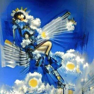 A painting of a robot angel, flapping her wings in the night sky by Shirow Masamune, Trending on artstation, blue color scheme.(一张机械天使在夜空中挥动翅膀的画,士郎正宗创作,以 Artstation 为参考库,蓝色配色)