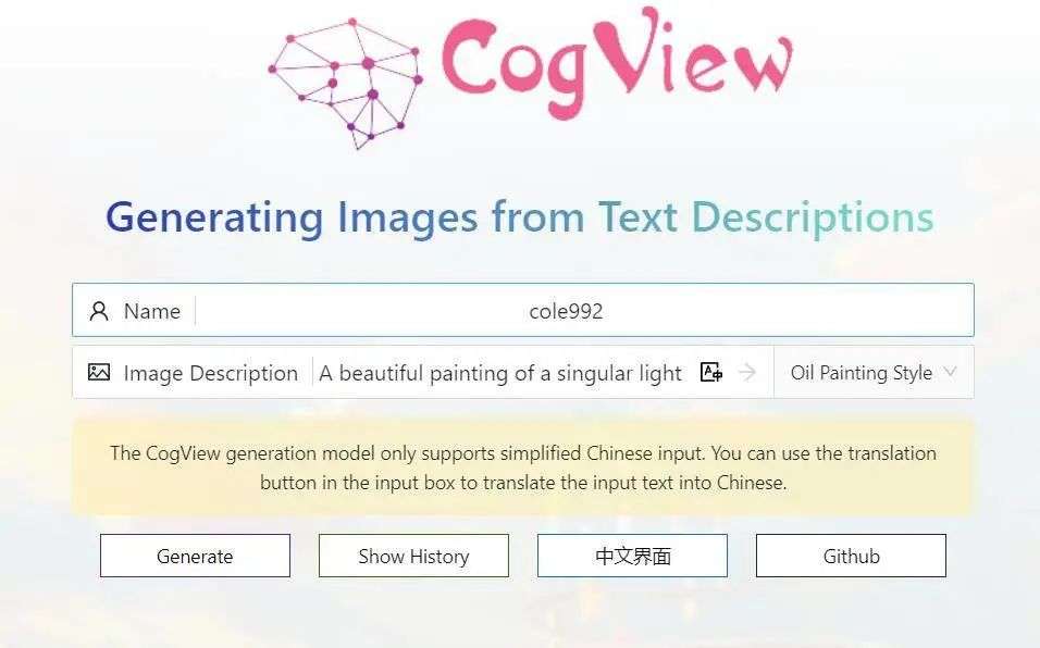 从输入英文关键词网页会翻译为中文再运算这一点推断,该程序应该是以汉语为语言进行训练的,在一堆只能用英文输入的同类 AI 中显得难能可贵。