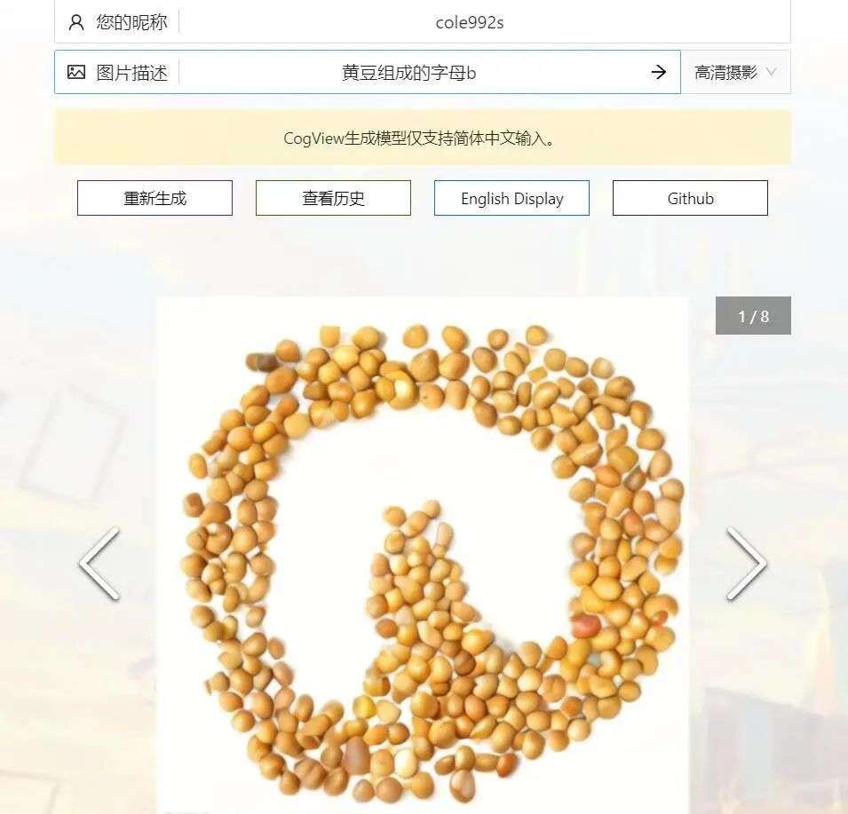 其实这款程序最擅长的是真实的照片生成,而非艺术绘画。比如当我们输入「黄豆组成的字母 b」时,AI 会给我们八张符合描述的真实照片。