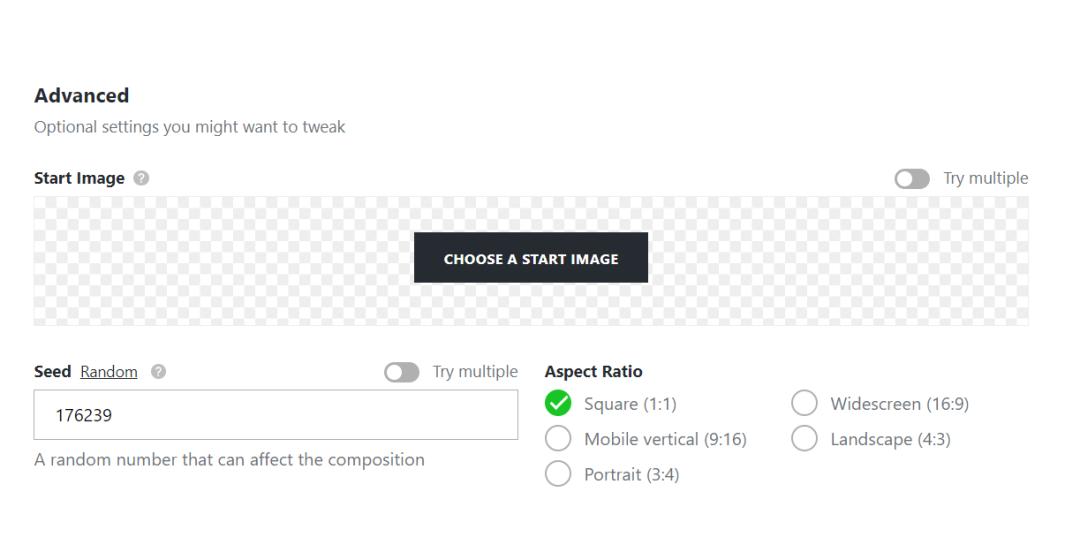 如果不满足于默认图像的尺寸,你还可以在关键词输入界面打开「Show advanced options(显示高级选项)」。在此模式下你不仅能自定义图像的尺寸,还可以设定多张参考的底图。