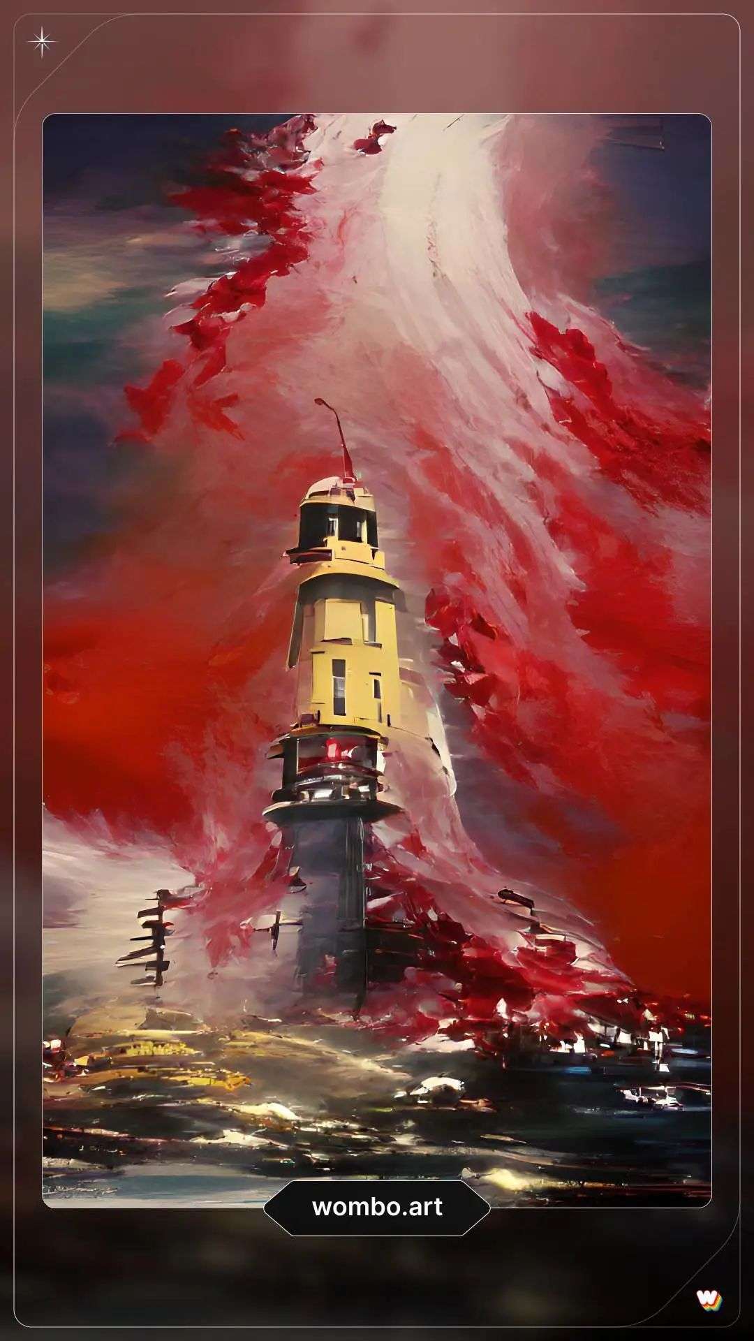 「a singular lighthouse, shining its light across a tumultuous sea of blood」 是内容描述,决定了你的画面中将出现什么,这里自由发挥即可。