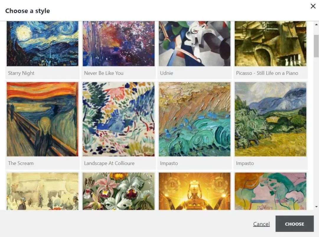 风格转移工具的使用也很简单。上传一张照片,从 64 种名画风格中挑选一个,再等 1-2分钟,一张惊艳的图片就诞生了。