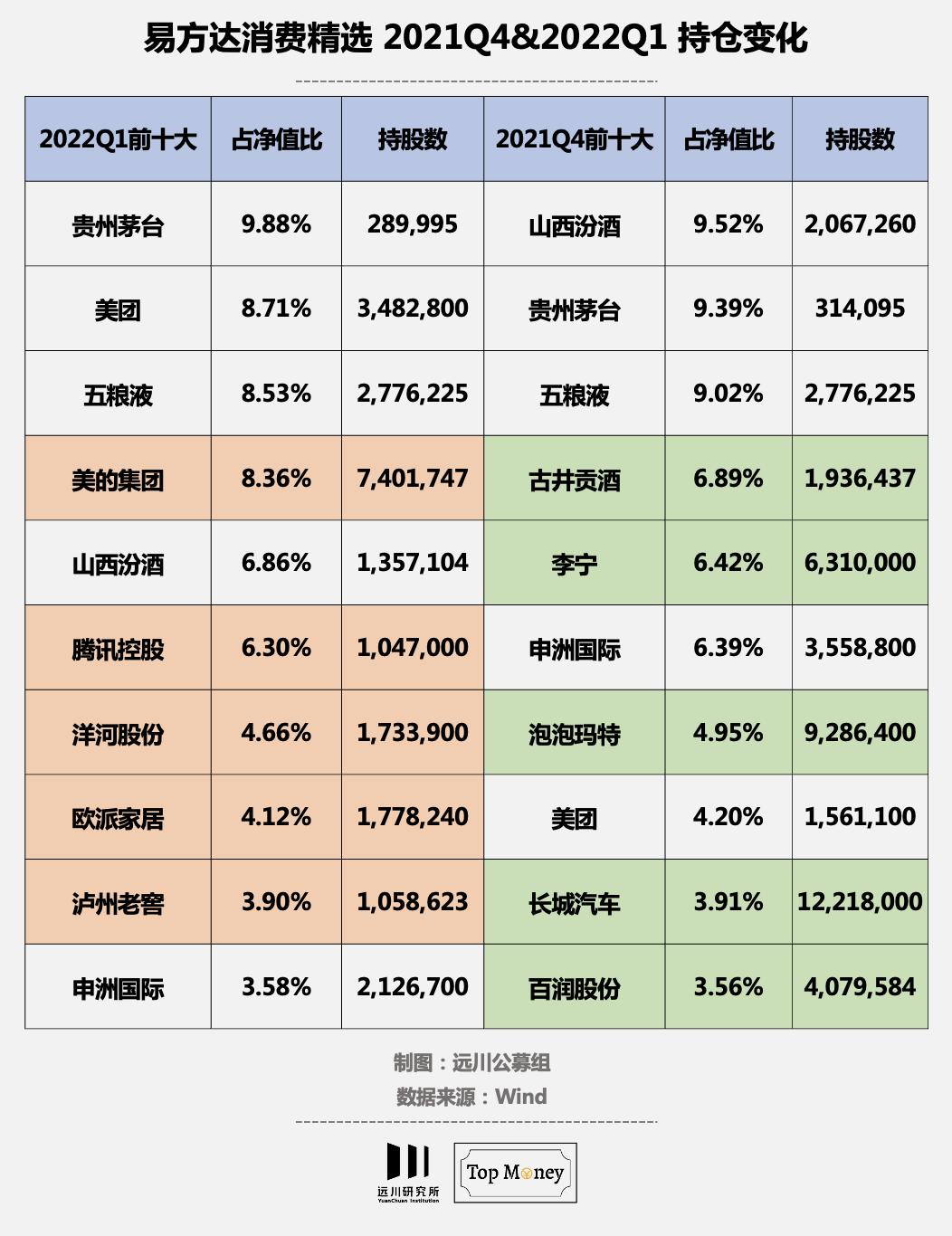橙色底为 22Q1 新进前十大的个股,绿色底为 22Q1 退出前十大的个股