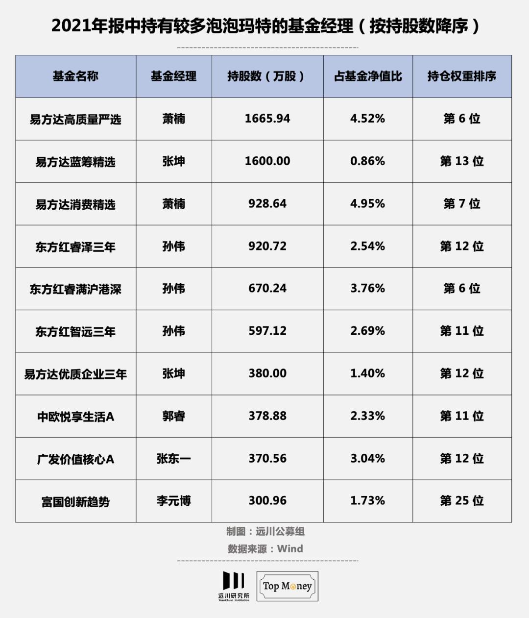 在 2021 年底,整个市场里买了最多泡泡玛特的基金经理,在分布上呈现出了一个挺有意思的现象,同样以基本面研究见长的两家公募基金公司——广州的易方达和上海的东方红,不仅持股数最多,萧楠和孙伟名下的部分基金甚至买到了前十大重仓股的位置。
