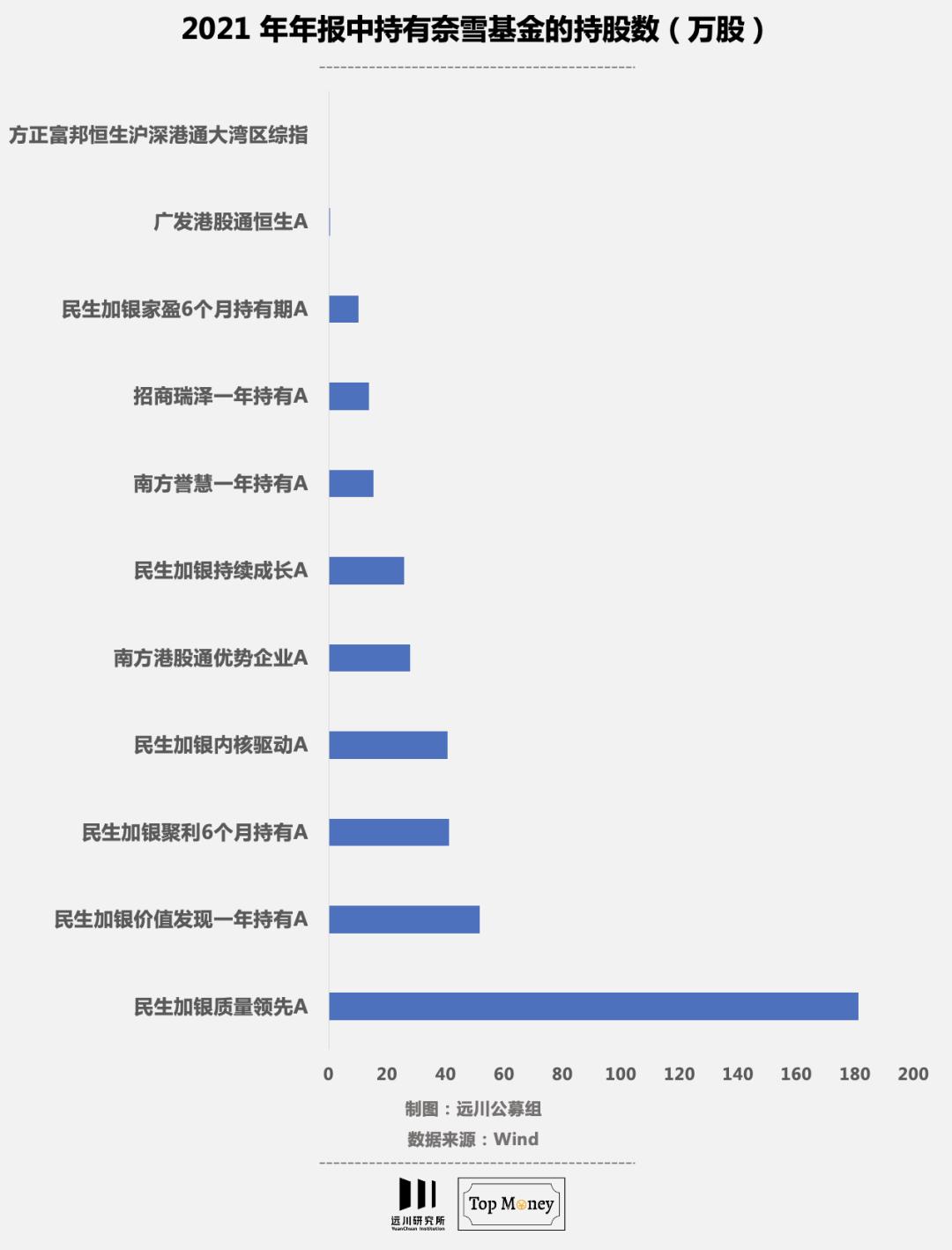 从时间上相对滞后的2021 年年报来看,持有这两个公司的公募基金数量,均不到行业总数的 1%,持有海伦司的只有 26 家,其中富国是买了最多的基金公司;买了奈雪的,更是只有可怜的 11 家,以民生加银旗下的基金居多。