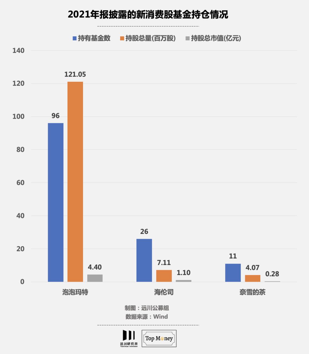 从 2021 年年报来看,泡泡玛特无论从持有基金数、持股总量还是持股总市值上都遥遥领先,海伦司次之,奈雪的身后则最冷清。
