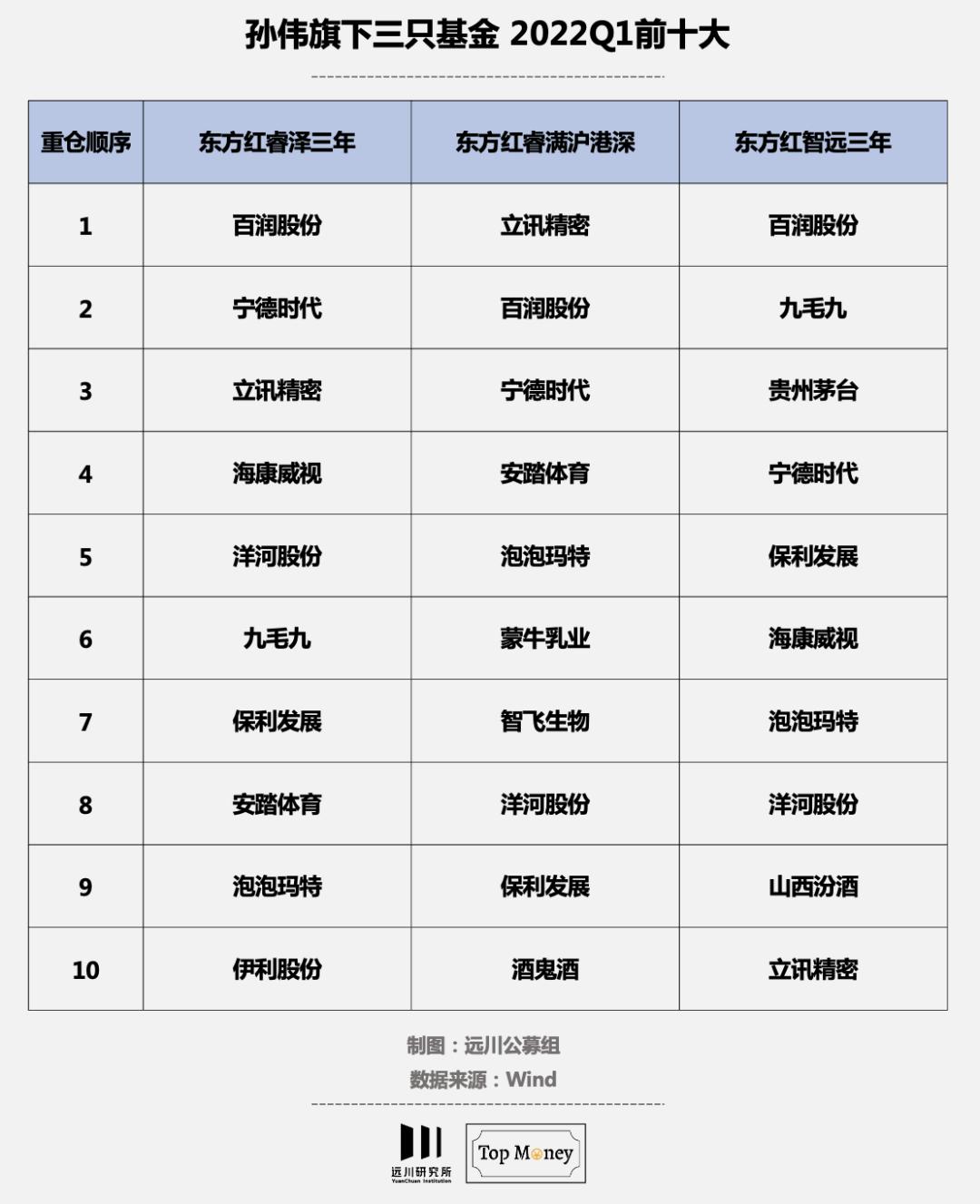 相反,错过了不少大牛股早期高爆发阶段的东方红基金经理孙伟,在泡泡玛特上则表现出了逆势加仓的豪情。在 2021 年还只在名下一只基金里小试重仓的孙伟,在今年一季度又大举增持泡泡玛特,并买到了名下全部三只基金的前十大重仓股。