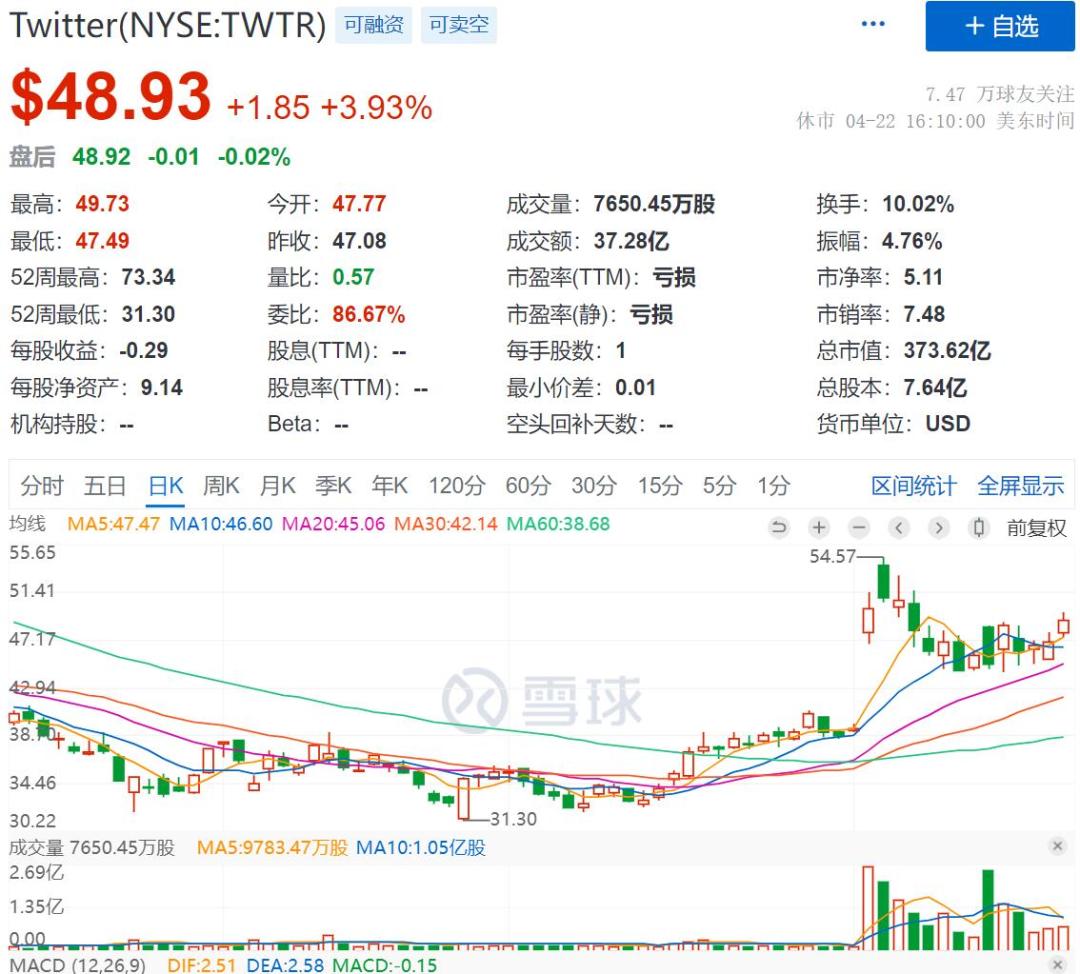自马斯克于 4 月 14 日发起收购要约以来,推特股价已上涨 6.7%。目前的交易价格仍比马斯克出价低近 10%,这似乎表明人们对他的收购前景持怀疑态度。