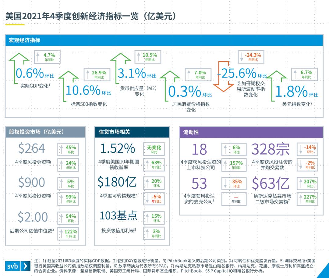 可以说,2021年超出了预期,最关键的创新经济基本面达到历史最高水平。美国风投资本市场中,募资额比2020年增长38%,可投资金增长48%,投资额增长98%,后期估值增长112%,并购交易量增长34%。在新冠肺炎感染人数上升、通货膨胀、人才短缺和市场低迷的背景下,我们迈入了2022年,现在的问题是:创新经济会继续增长吗?