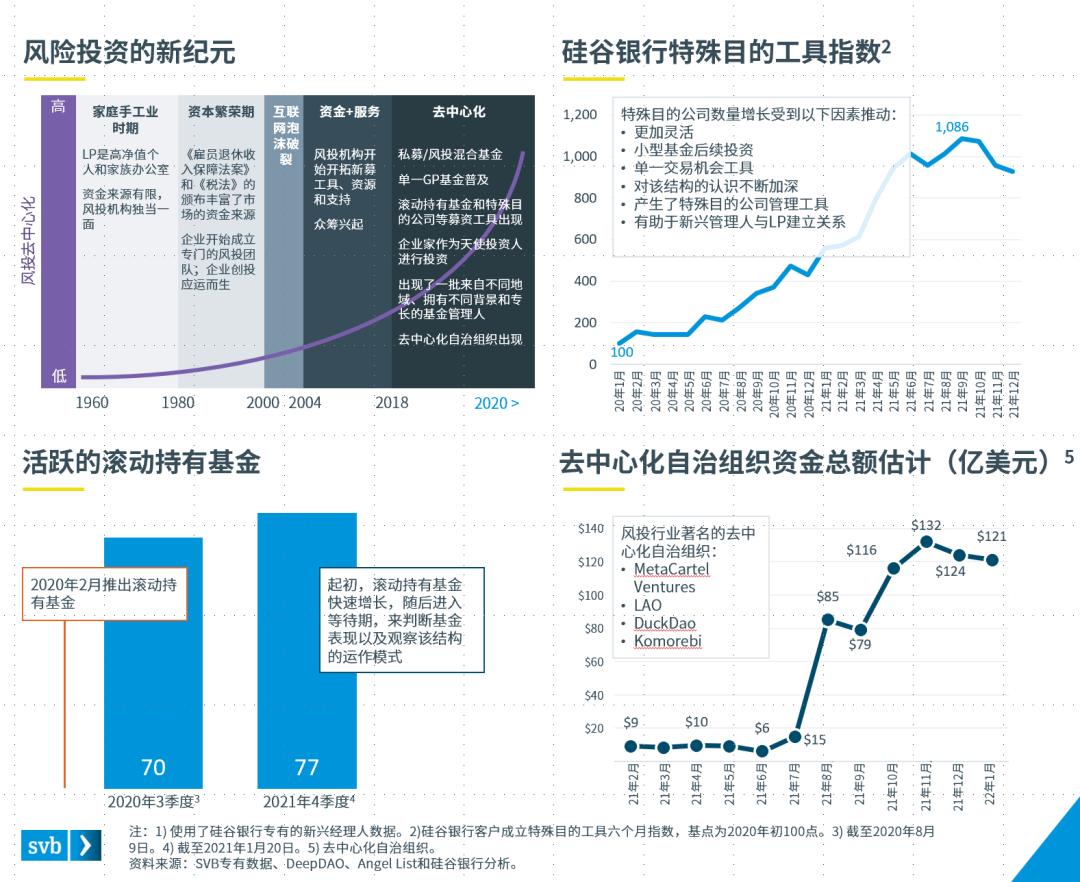 从差异化向去中心化转变的趋势从2018年开始出现,在新冠疫情大流行开始时加速。大部分资金不再由沙山路(Sand Hill Road)的精英控制,私募/风投混合基金正在以创纪录的速度进行大规模投资。另一方面,自2020年以来,新兴基金管理公司成立数增加了约97%。此外,新的投资工具增加了参与基金投资的机会,并颠覆了传统的基金结构。滚动持有基金允许个人按季度对新基金进行小额投资。去中心化自治组织(DAO)可能是接下来风投行业的一大创新,也可能重蹈首次代币发行的覆辙。目前只有少数去中心化自治组织专注于风险投资。去中心化自治组织让投资者可以通过投票集体决定资金的部署,因而产生了一个去中心化和民主化的结构,可以解决目前风投行业的许多问题。