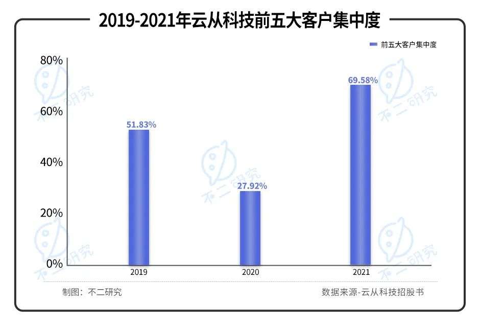 不过,云从科技正面临客户集中度升高的局面。招股书显示,2019年~2021年,前五大客户集中度分别为51.83%、27.92%和69.58%。过于依赖少量大客户,云从科技的未来可持续经营性恐面临考验。
