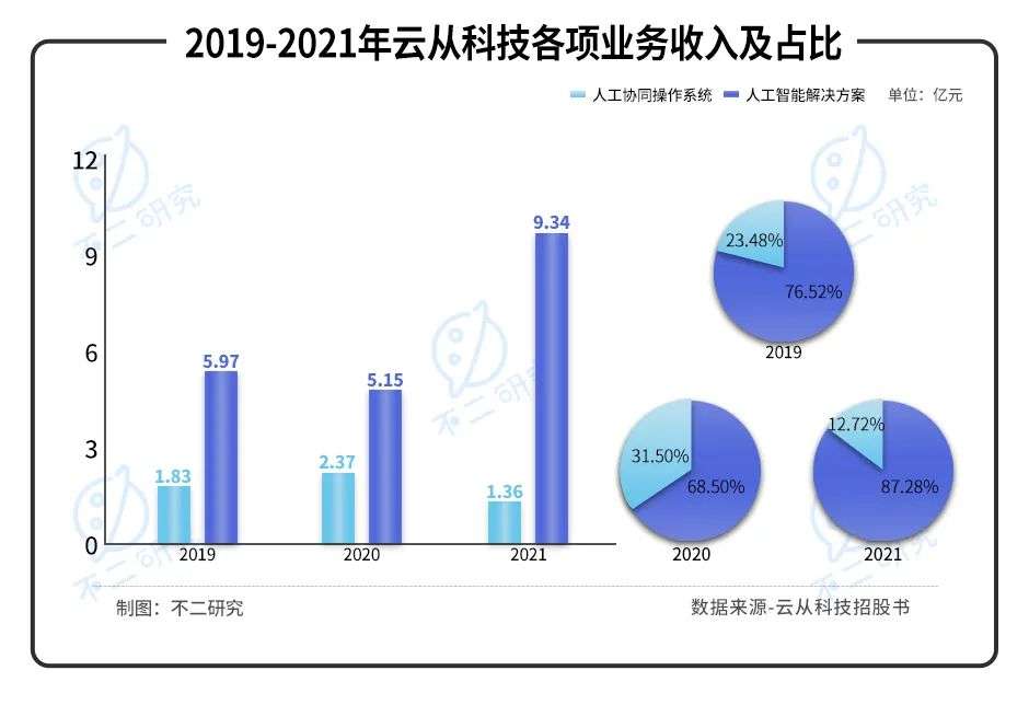 招股书显示,2019年~2020年,人机协同操作系统收入分别为1.83亿、2.37亿和1.36亿元,占总营收比重分别为23.48%、31.50%和12.72%;人工智能解决方案收入分别为5.97亿、5.15亿和9.34亿元,占总营收比重分别为76.52%、68.50%和87.28%。