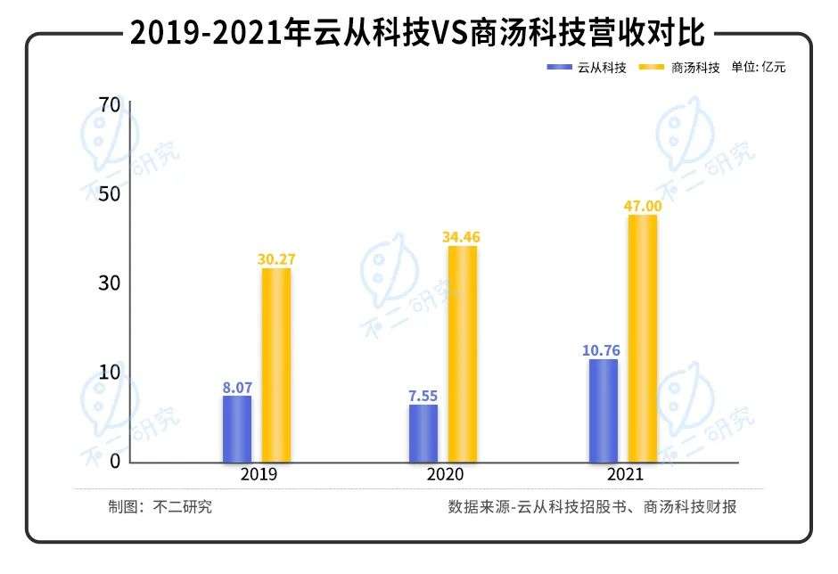 与巨头相比,云从科技差距仍大。2019年~2021年,商汤科技总营收分别是30.27亿元、34.46亿元和47.00亿元,同期云从科技的体量不到其三分之一。2020年同受疫情影响,商汤科技取得13.84%的增长,而云从科技却同比下跌6.44%。此消彼长下,短时间内云从科技赶超无望。