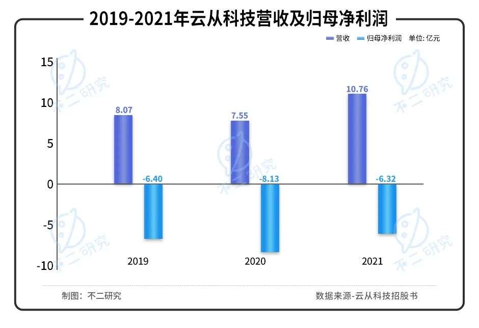 招股书显示,2019年~2021年,云从科技营收分别为8.07亿、7.55亿和10.76亿元。由于2020年营收基数较小,2021年同比增长高达42.6%。
