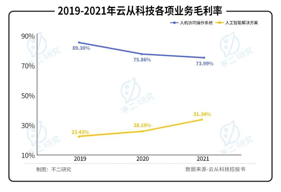 AI供应链特性使然,云从科技两项业务毛利率天差地别。根据招股书,2019年~2021年,人机协同操作系统毛利率分别为为 89.30% 、75.86%和 73.99%;人工智能解决方案毛利率为23.43%、28.19%和31.34%。
