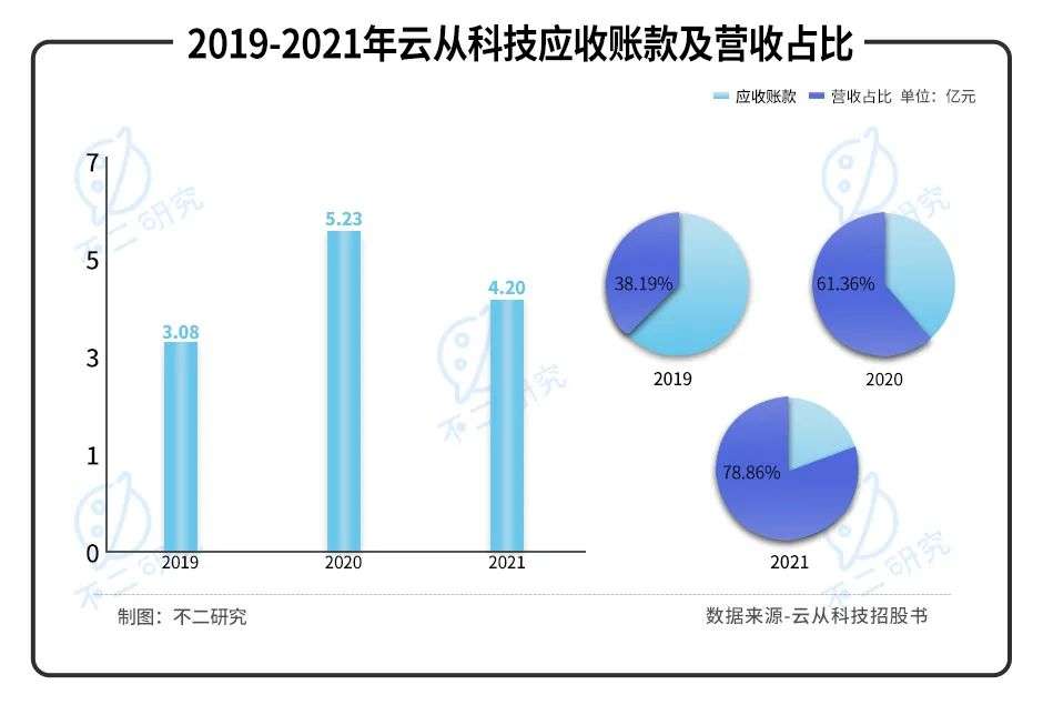应收账款居高不下,同样会对盈利能力产生负面影响。近三年,云从科技应收账款居高不下,对应余额分别为3.08亿、5.23亿和4.20亿元。尤其2020年受疫情影响,应收账款占当年营收的近7成;其他年份应收账款也已接近当年营收的4成。