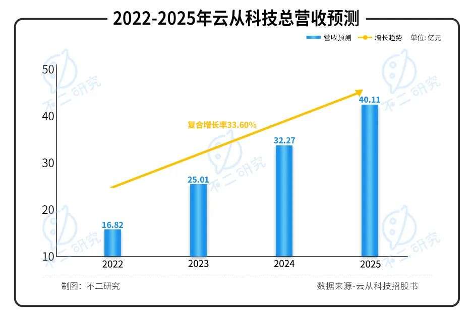 招股书中,云从科技表示计划将于2025年扭亏为盈。根据预测结果,2022年~2025年云从科技总营收将分别达到16.82亿元、25.01亿元、32.27亿元和40.11亿元,复合增长率为33.60%。