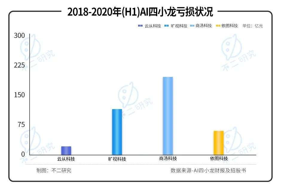 「不二研究」发现,亏损严重已然成为“AI四小龙”的共性。2018年~2020年,旷视科技合计亏损127.3亿元;商汤科技合计亏损205.48亿元;2018年~2020年上半年,依图科技合计亏损61.02亿元。云从科技在其中亏损幅度最轻。