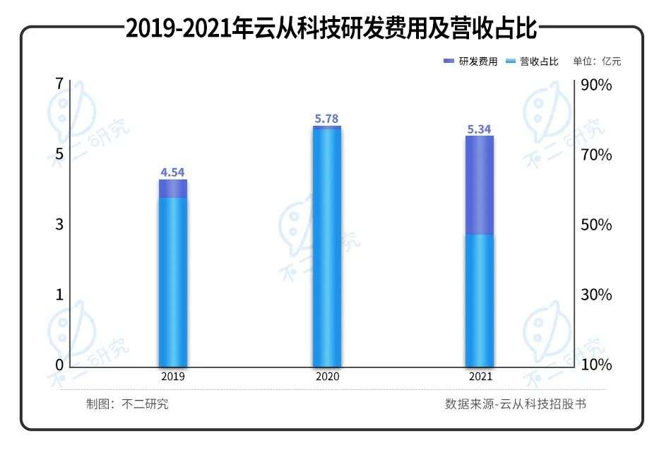 此外,研发费用的增长趋势已让云从科技不堪重负。招股书显示,2019年~2021年,云从科技的研发费用分别为4.54亿、5.78亿和5.34亿元,占总营收比重分别为56.25%、76.59%和49.67%。在竞争加剧、研发内卷的行业大势下,研发费用或还将持续增长。