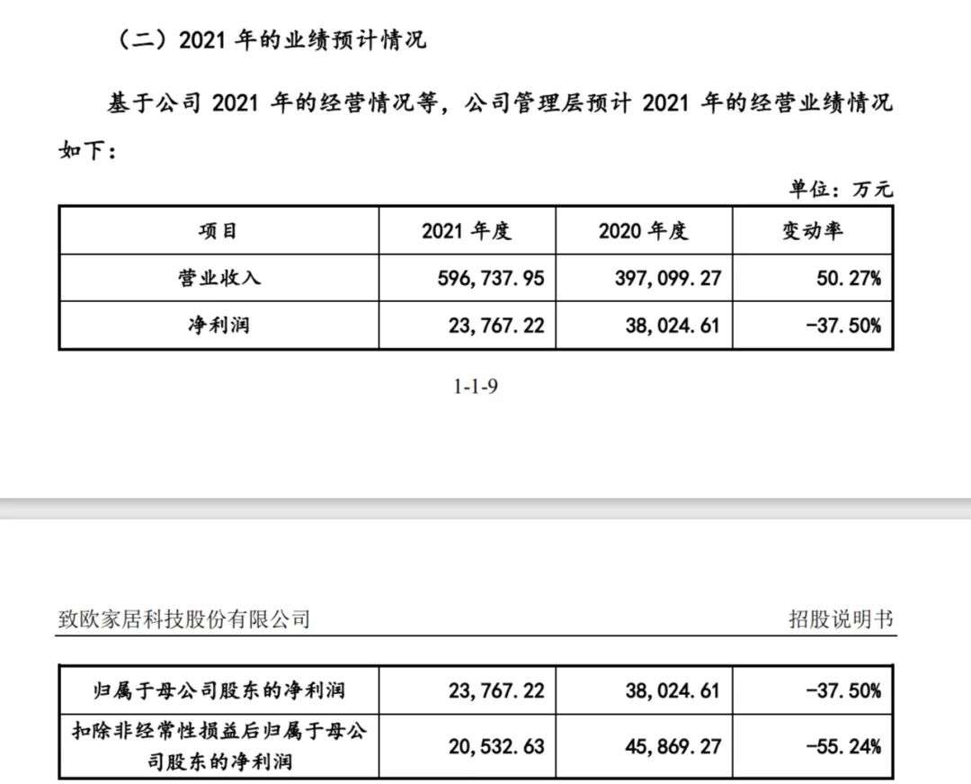 据致欧家居招股书数据,公司2021年归母净利润同比下滑37.5%。