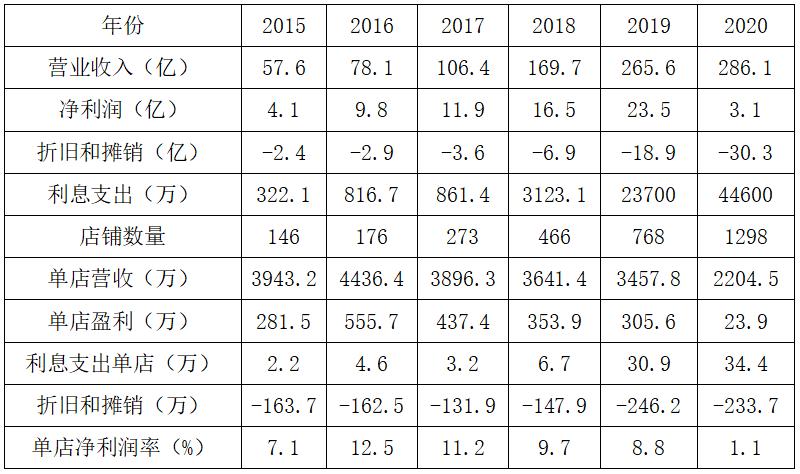在2016-2019年期间,公司财务费用支出的增长幅度要远高于企业利润的增长幅度。公司的利息支出从816.7万增加到2.37亿,平均到单店的利息支出从4.6万增加到30.9万。公司还拿出巨额资金购置固定资产,随着固定资产的提升,公司的折旧和摊销成本不断提升,从2016年的2.9亿提升到2019年的18.9亿,平均到单店从162.5万提升到246.2万。