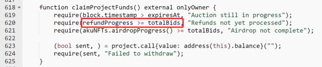 其中被红框标记起来的是一个判断条件,refundProgress >= totalBids,问题也恰恰出在这里。