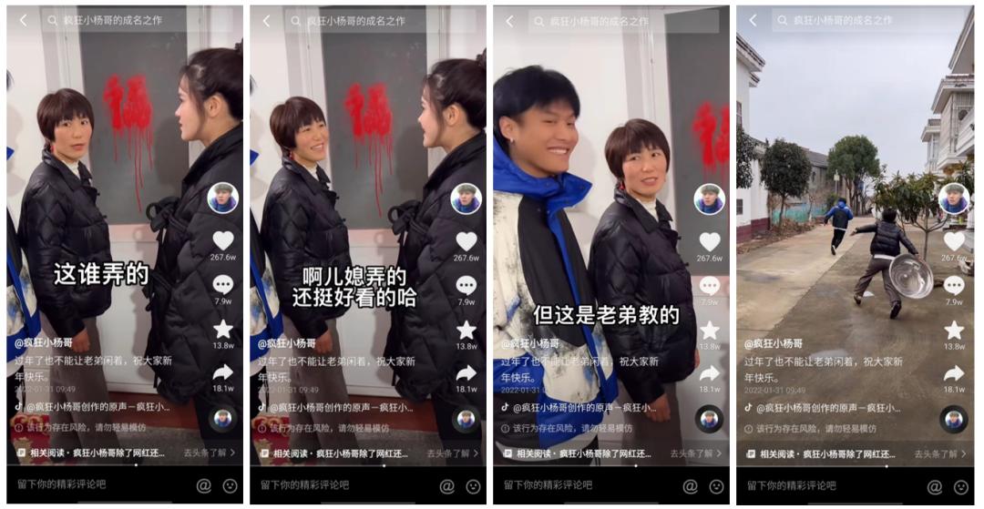 如@疯狂小杨哥 视频中有一小段剧情是,门上的“福”字被贴坏了,一开始大家相视无言,随后妈妈生气质问,知道是儿媳妇干的之后,立马变脸笑着鼓励。