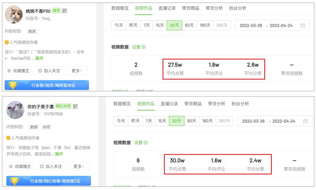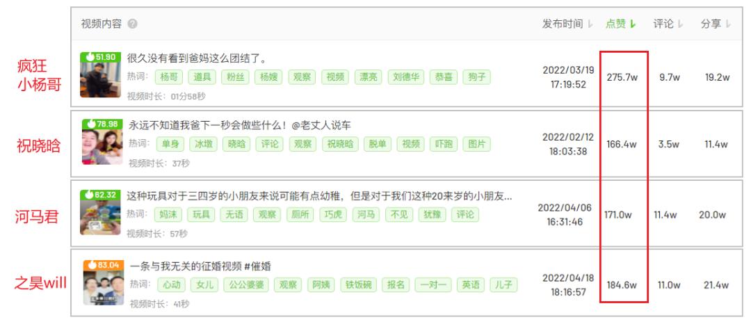 运营社发现,父母互动类视频的转发数据都不错。@姚姚不是P30 的平均点赞为 27.5w ,平均分享为 2.6w ;@你的子笺子凛 的平均点赞为 30w ,平均分享为 2.4 w 。也就是大约每 10 个点赞的用户中,就有 1 个人转发分享。