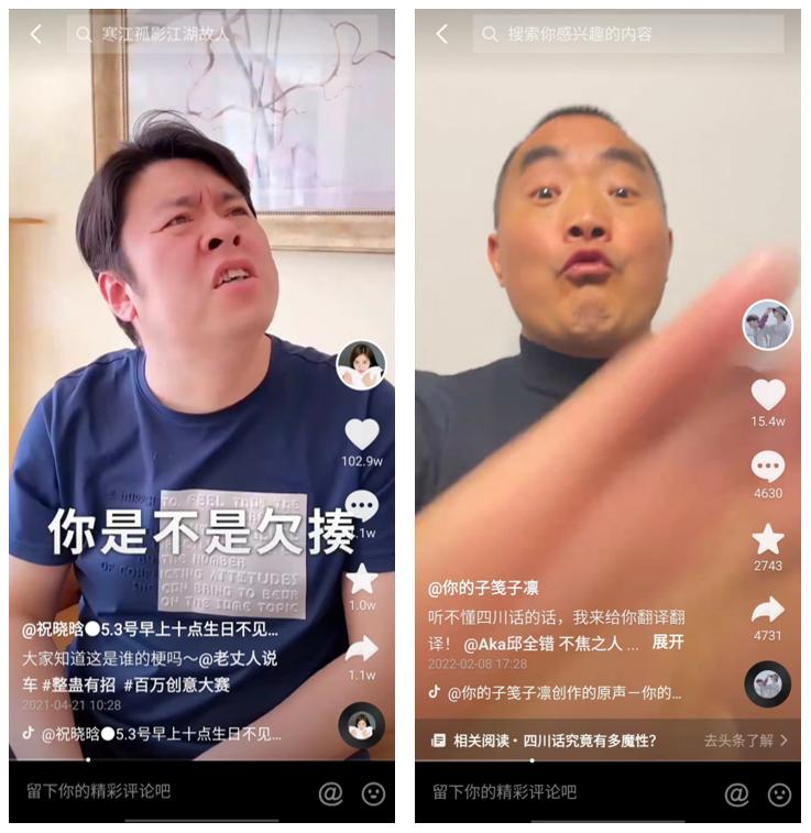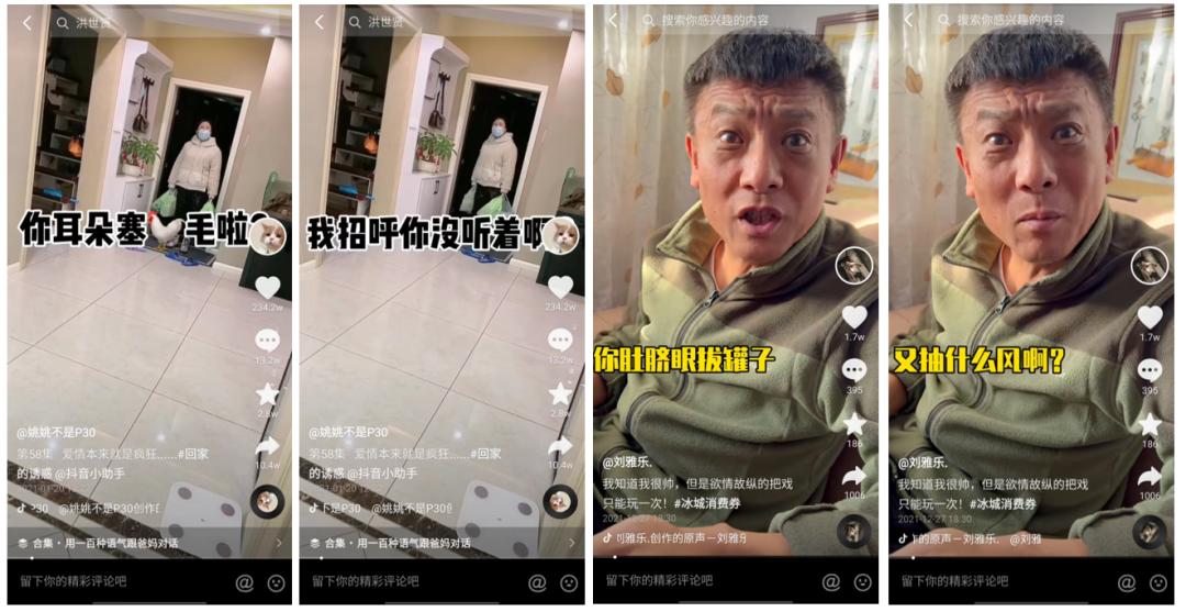 @姚姚不是p30 和@河马君 等博主则经常和父母斗嘴。@姚姚不是p30 的许多视频都以“当我用xx的语气和我妈说话时”作为主题,经常使用蜡笔小新、艾莉(电视剧《回家的诱惑》中一角)、摆烂文学等网络热梗。