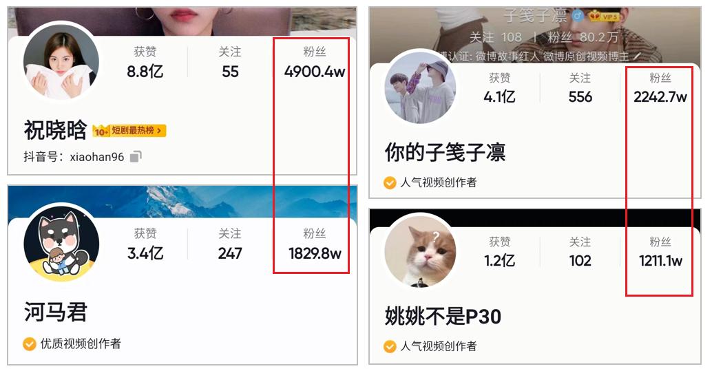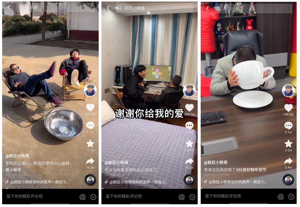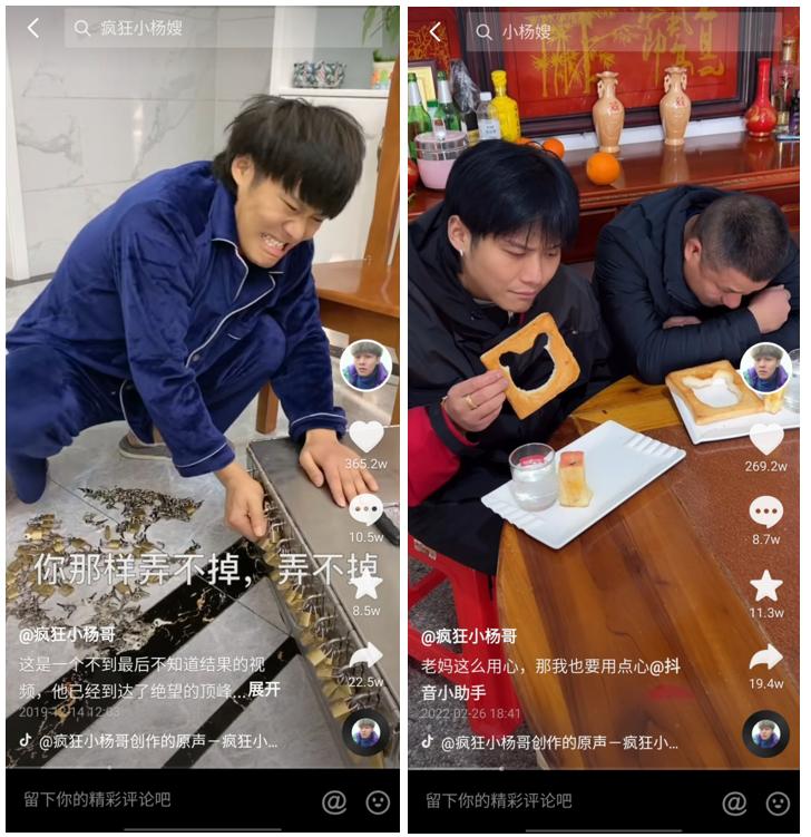除了@疯狂小杨哥 之外,和父母互动的视频还带火了不少博主,在抖音上,已经有不少相同赛道的博主粉丝量过了千万。