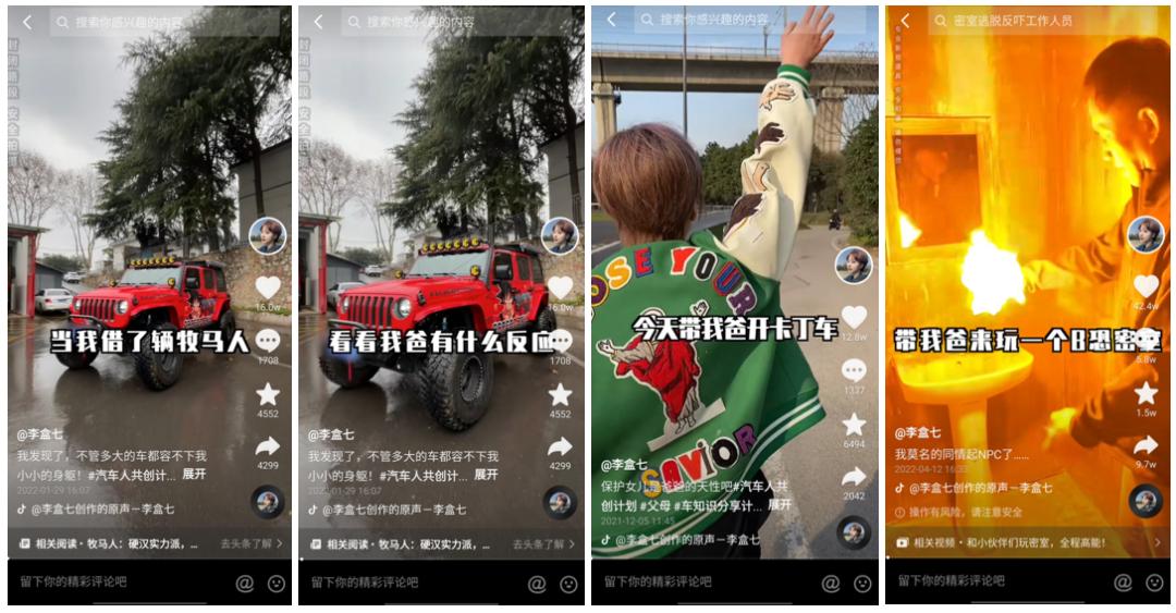 比如爱车的@李盒七 会借来不同的车,和爸爸一起体验,还会带着爸爸去玩年轻人玩的娱乐项目,比如开卡丁车、玩密室逃脱等。