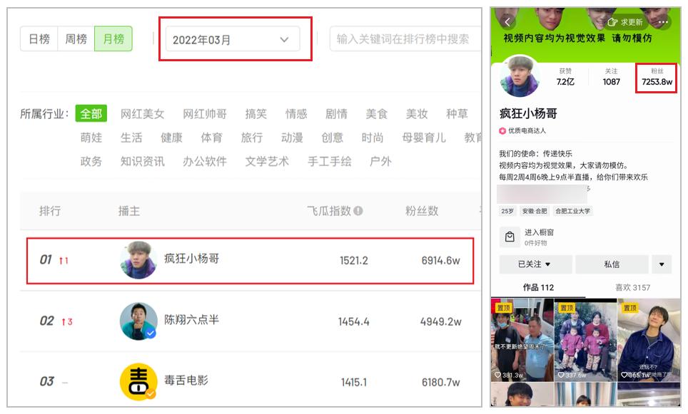 在飞瓜数据 3 月抖音博主排行榜中,@疯狂小杨哥 账号的综合排名达到抖音第一。现在,@疯狂小杨哥 的粉丝数也已经超过 7000 万,成为了粉丝量最多的抖音个人账号。
