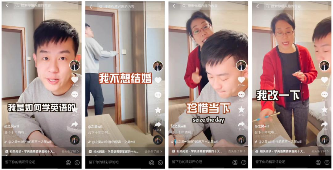 比如,@之昊will 的视频中,表示自己学英语的方式就是激怒老妈,当她说英文的时候,自己就可以练习听力,写完后妈妈还会主动为他“批改”。