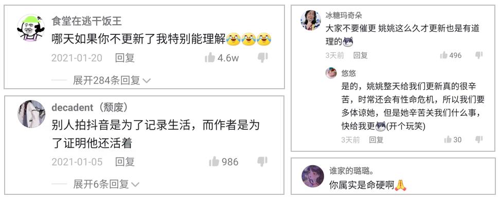 久而久之,粉丝开始在评论区自创“梗”。比如看到博主被父母“收拾”后,粉丝会表示博主实在是“命硬”、“不更新了也能理解”、“作者拍抖音是为了证明自己还活着”。