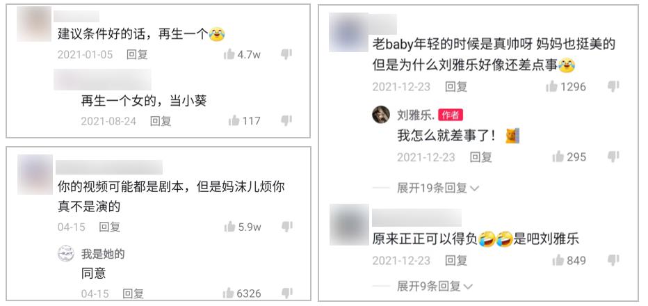 当粉丝们感受到父母对博主“嫌弃”的情绪时,还会加入一起调侃博主的大军。在视频的评论区里,几个高赞的评论都是粉丝们对博主的“调侃”,比如“建议条件好的话再生一个”、“妈妈烦你真不是演的”。