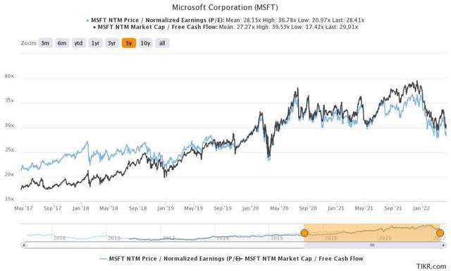 微软的股票继续在最近的3月底部附近徘徊,经历了自疫情以来的最大跌幅。但是,我们认为过去五个月的价值压缩已使MSFT股票倍数正常化,其股票已恢复到其5年市盈率和FCF倍数均值。