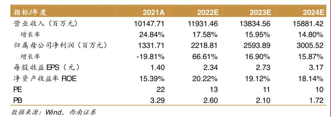 从财报上来看,2021年营收101.48亿元,同比增长24.84%,首次破百亿;归属于上市公司股东的净利润13.34亿元,同比下降19.66%;基本每股收益1.41元。