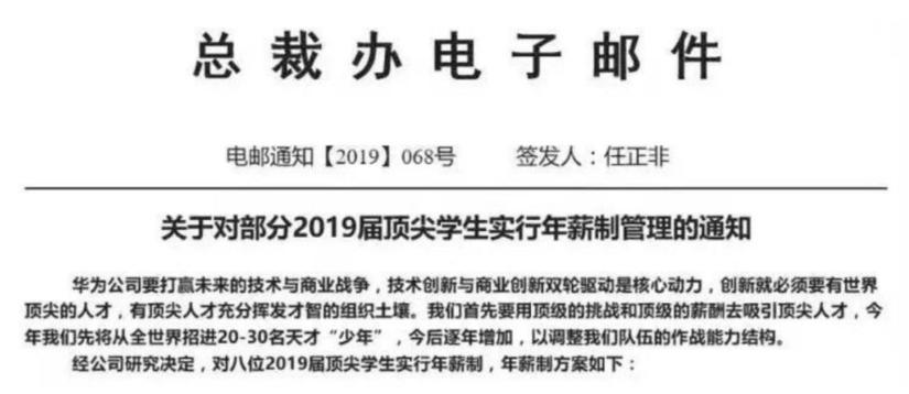 2019年6月,华为创始人兼首席执行官任正非签署了一份内部文件,第一次提出了「天才少年」招聘计划,从全球范围内招募优秀青年。