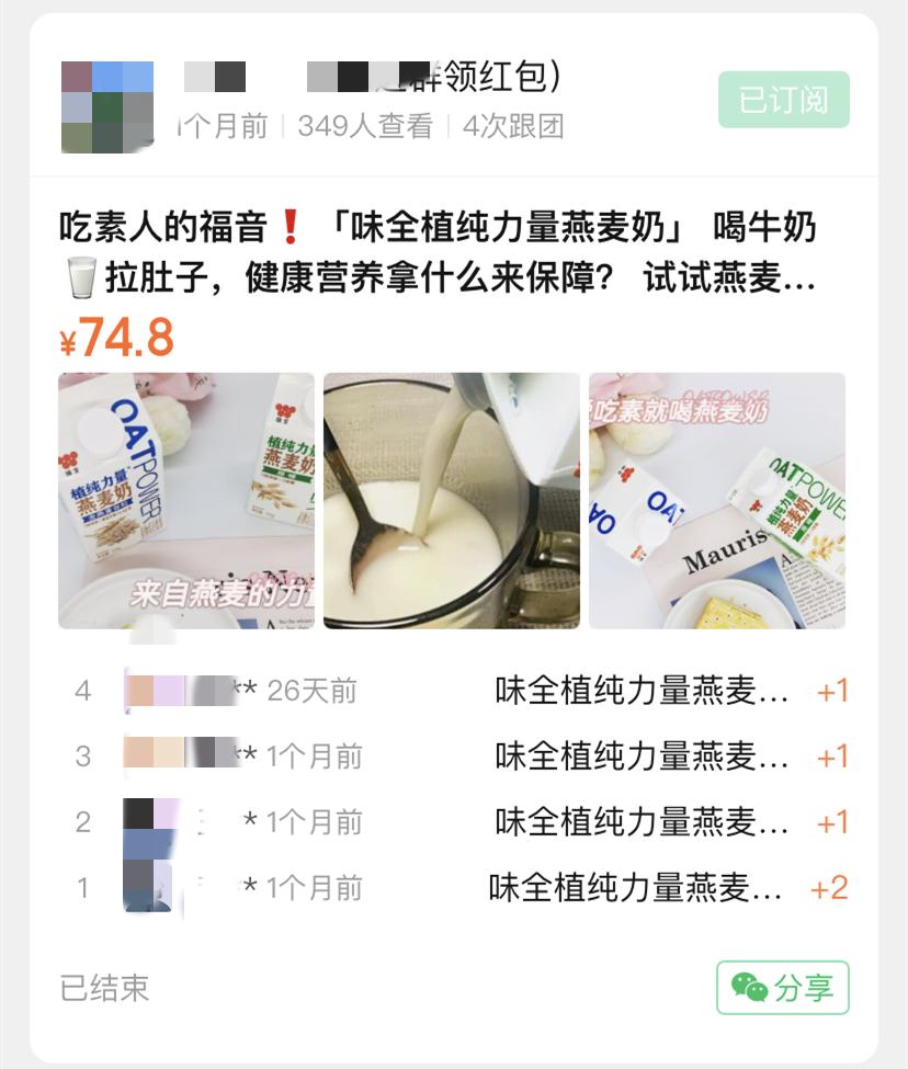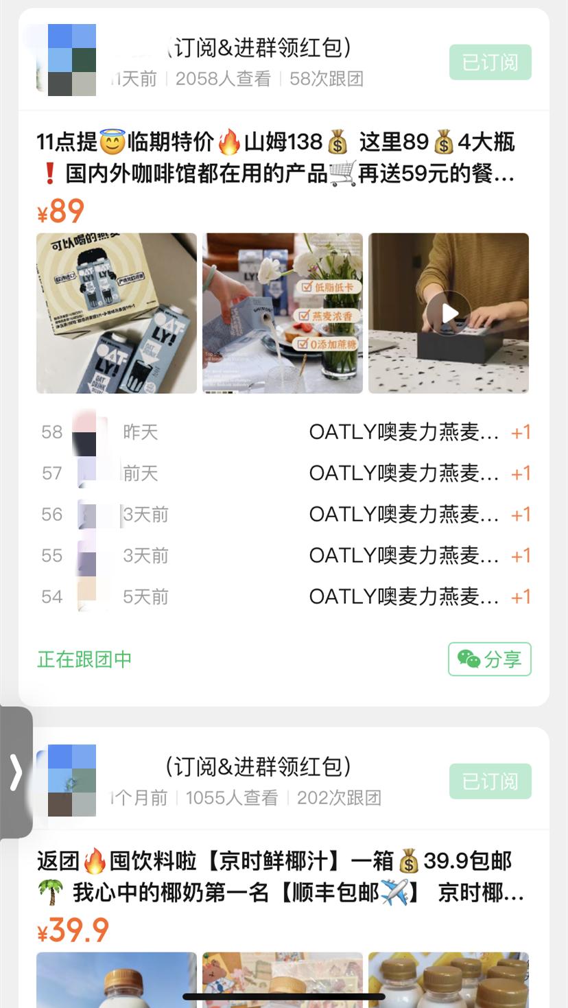 在社区团购平台上和临期食品仓平台上,也有大量的折扣植物奶信息。“可能还是销量不行,不打折就很少有人买。”小林说,即使是骨折价,植物奶的销量也远不如传统液态奶,不敢一次性进太多的货,一般都在采取预订模式,在拼团软件上或者微信群里接龙下单。网红产品还能有些销量,“大概一次最多一两百件,回购率也不是很高。”小林说,而更多小品牌的产品则根本不敢涉足。
